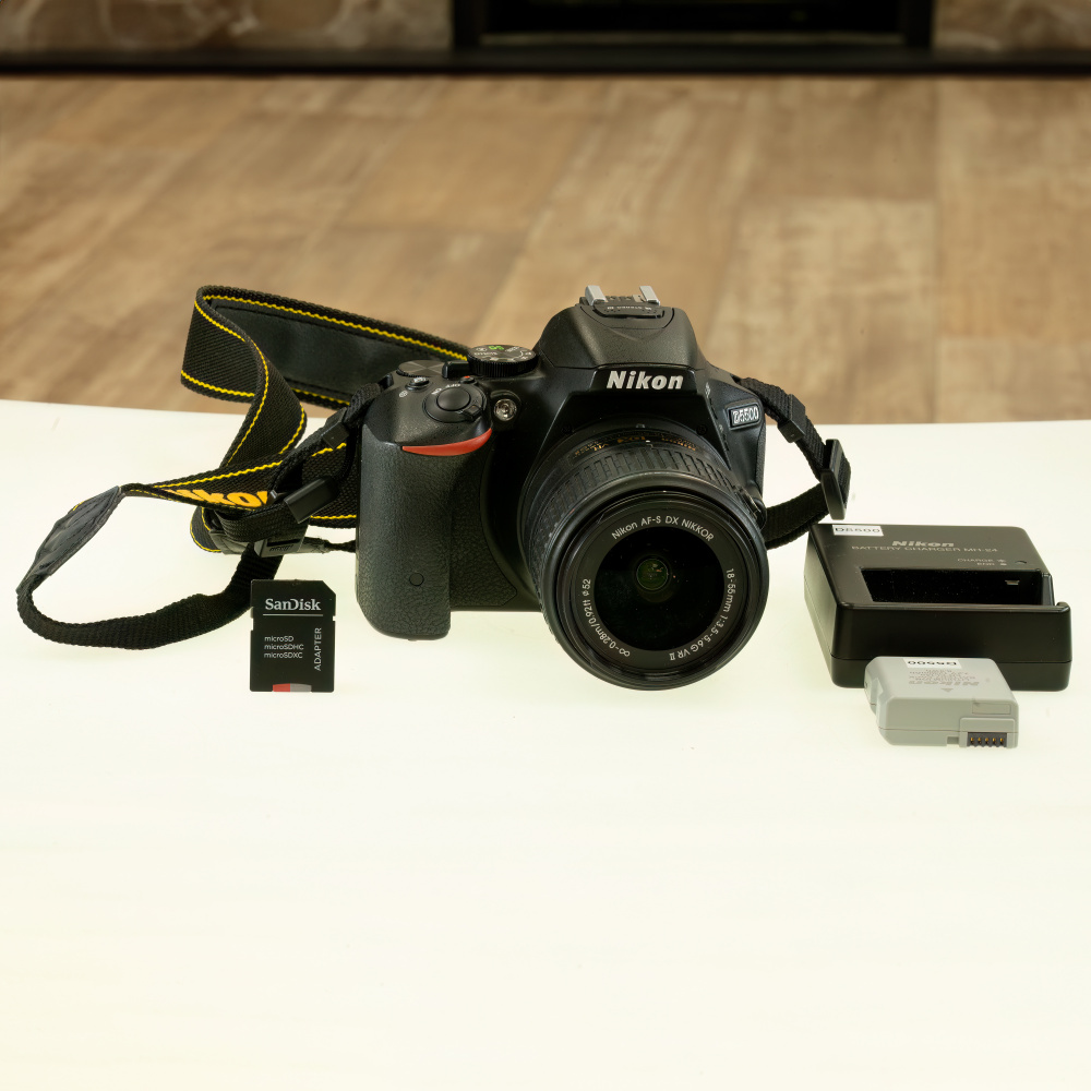 Nikon D5500 DSLR digital camera with full articulating touch screen and 18-55 zoom lens.